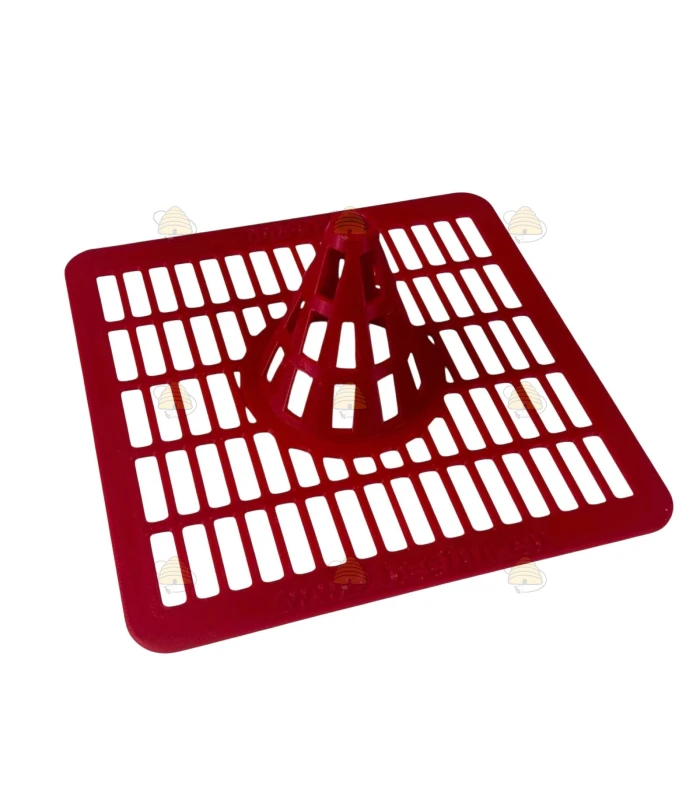 Dit frontje, afmeting 13,5 x 13,5 cm, voorzien van een kegeltje van 5 cm hoog is bedoeld voor de imker die zijn eigen hoornaarval maakt. De hoornaar kan door de kegel naar binnen vliegen, maar vervolgens niet meer naar buiten.