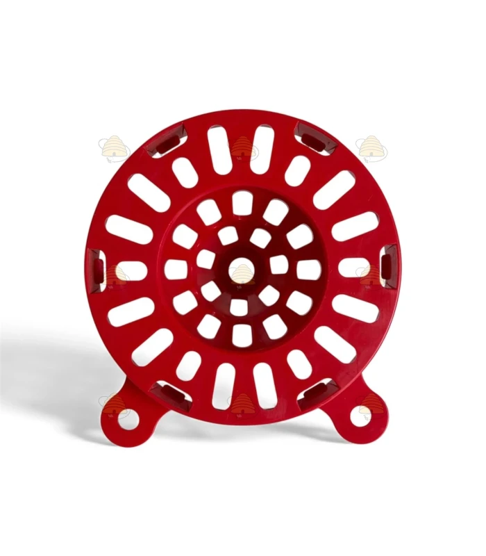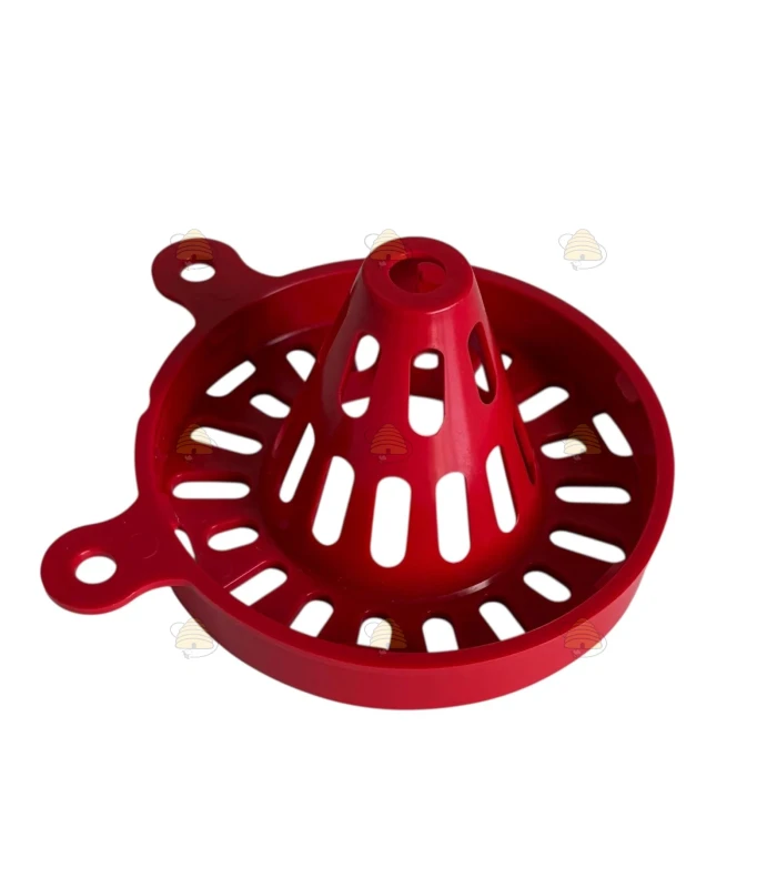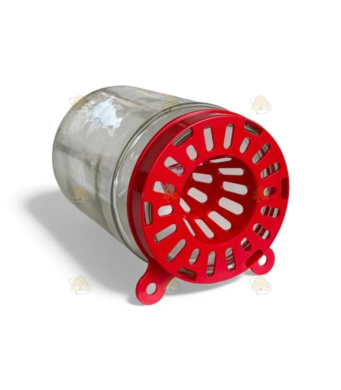 Rode liggende hoornaarval voor op een pot van 82 mm TO. Deze basis hoornaarval is zeer gemakkelijk te installeren (schroef de val op de pot en klaar) en biedt een goedkope oplossing om Aziatische hoornaars te kunnen vangen. Voeg de lokstof toe op een stukje spons in de pot. De val past op potten met dekselmaat 82 mm TO.