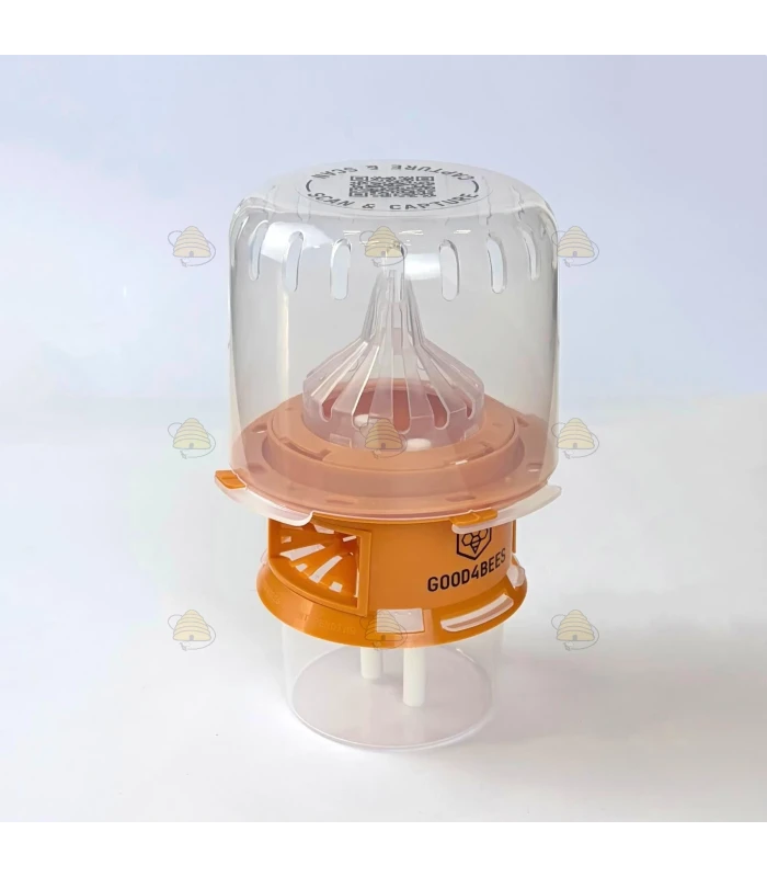 De openingen in het transparante bovendeel zijn precies afgestemd: klein genoeg om te voorkomen dat de Aziatische hoornaar ontsnapt, maar groot genoeg om andere insecten de kans te geven vrij weg te vliegen.
