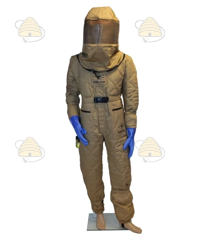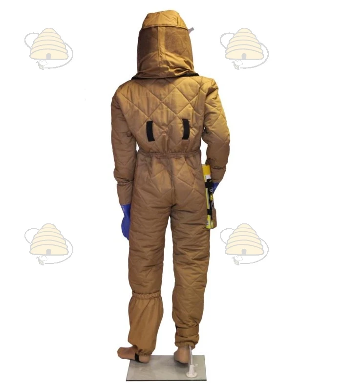 Compleet pak / overall in een beige kleur waarmee je jezelf uitstekend beschermt tegen de Aziatische hoornaar. Het pak is voorzien van zakken met rits en is gemaakt van een stevige stof dubbellaags die zorgt voor een enorm goede bescherming. In het pak bevindt zich een verstelbare helm van kunststof met een kunststof gaasvizier wat ervoor zorgt dat de afstand tussen het gaas en je hoofd altijd gelijk blijft en je nauwelijks door het gaas gestoken kan worden in je gezicht. De helm zit vast aan de kap met gaas d.m.v. klittenband. Het vizier zelf is gemaakt van een goede en stevige kwaliteit gaas. Je hebt maar liefst 180 graden zicht. De kap is los afritsbaar van het pak en kan dus ook los gewassen worden.