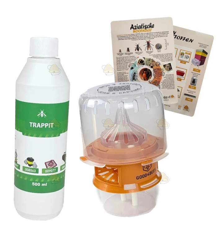 Een starterspakket voor het vangen van de Aziatische hoornaar. Dit pakket is voorzien van een selectieve Aziatische hoornaarval van het merk Good4Bees, 0,5 liter Trappit lokstof en een informatiekaart over de Aziatische hoornaar.
