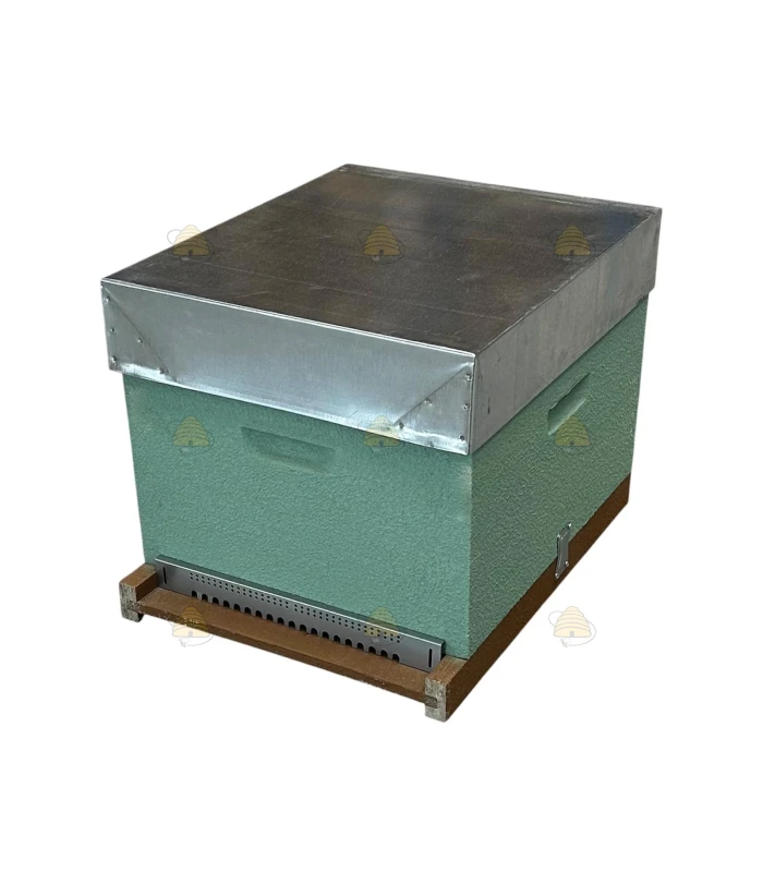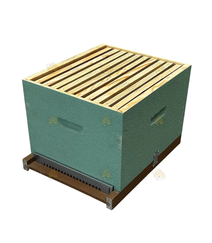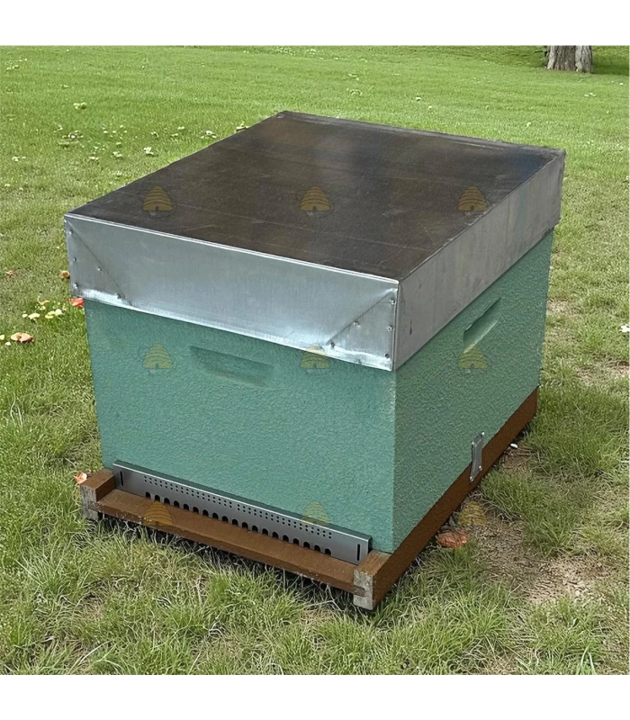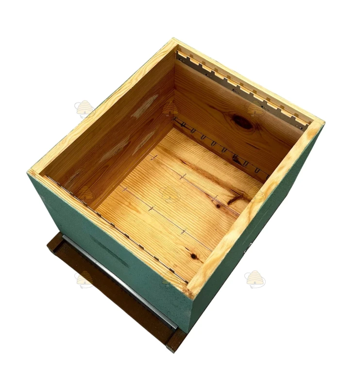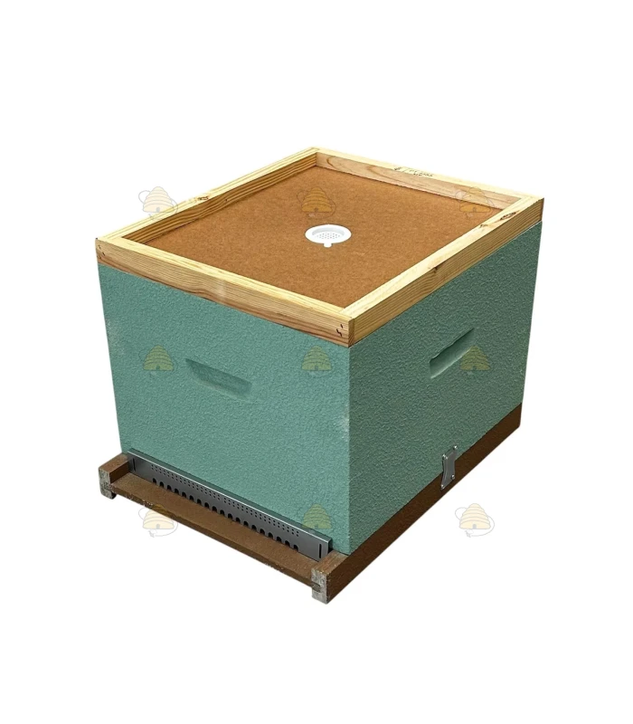 Kant en klare Dadant Blatt grenen bijenkast, compleet geleverd en reeds geverfd in het zeegroen. De bijenkast bestaat uit een houten bodem, 10-raams broedkamer, broedkamer ramen (10 stuks), afstandstrips, kamijzer, dekplank, dak en een vlieggatschuif.