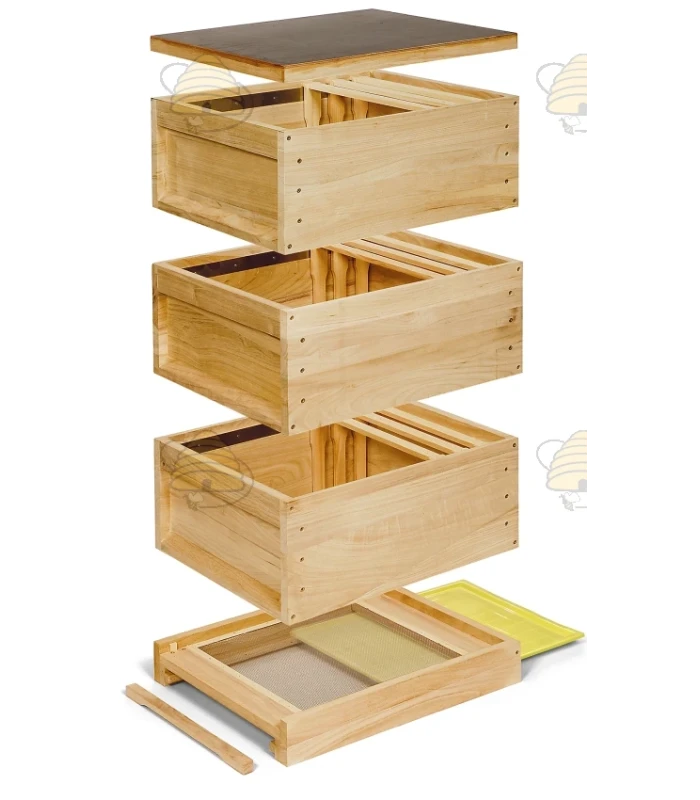 Duits Normaal houten bijenkast 12-raams, voorzien van een hoge bodem. De bodem is voorzien van een ventilatierooster en een vlieggat met blokje. Het dak is geïsoleerd en de kamers zijn voorzien van RVS draagrails voor de ramen. Deze bijenkast wordt exclusief ramen geleverd.