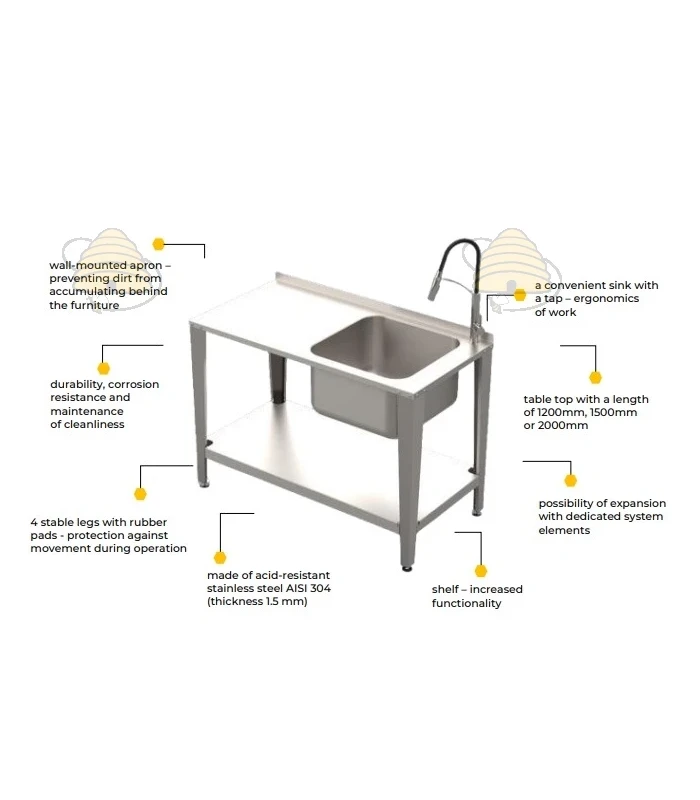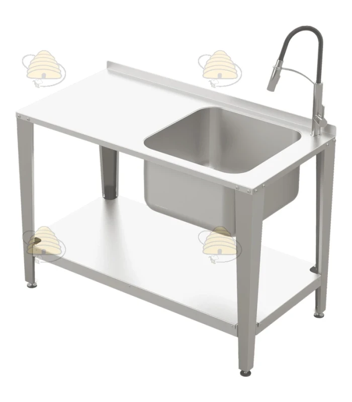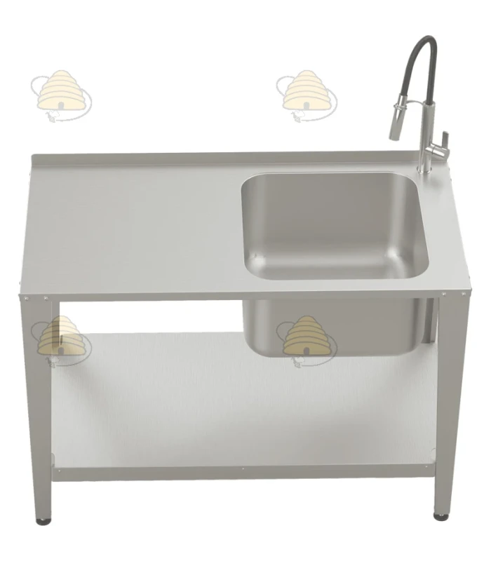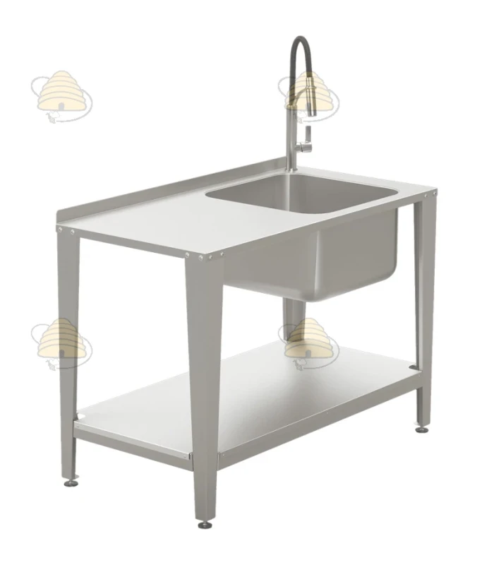 Werktafel voor de productie van honing, voorzien van een spoelbak en kraan. De gehele tafel is gemaakt van hoogwaardig, voedselveilig, zuurbestendig AISI 304 roestvrij staal (1,5 mm) en biedt een ergonomische, comfortabele, hygiënische werkplek met toegang tot water. Deze tafel is bedoeld voor professionele imkers en werkt ideaal voor hygiënische honingproductie of bijvoorbeeld voor het wassen van gereedschappen.
