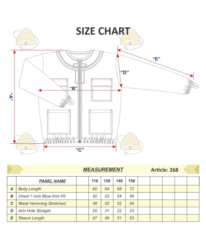 Kinder imkerjack met ronde hoed, gemaakt van dun dicht geweven katoen. Het pak heeft een zak aan de voorzijde en wordt geleverd in de kleur wit. Verkrijgbaar in de maten: 116, 128, 146 en 158 (selecteer maat).