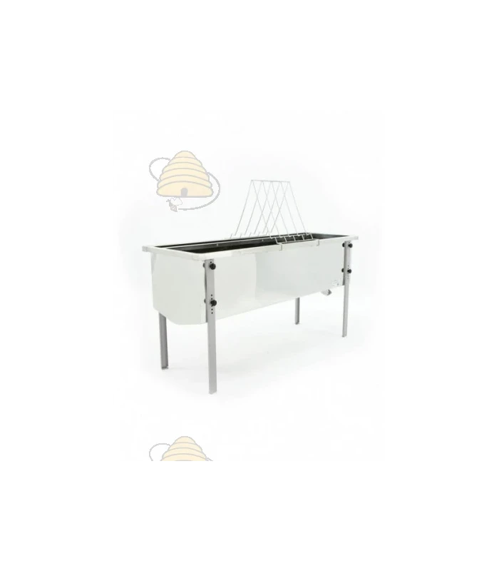 Verstevigde ontzegeltafel, geheel gemaakt van RVS, met een breedte van 1000 mm. Dit maakt de tafel uiterst geschikt voor Dadant ramen. De tafel heeft een trapeziumvormige bodem voorzien van kraan, een zeef en is voorzien van een stelling waar de ramen voor het ontzegelen op geplaatst kunnen worden. De tafel kan daarnaast ook op hoogte ingesteld worden. Om trilling te voorkomen staat de tafel op rubberen voetjes. Een handig en degelijk apparaat.