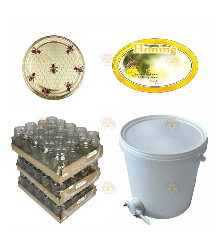 Starterspakket wat alle essentials bevat om jouw honing af te vullen. Dit pakket bestaat uit 60 stuks van de meest gebruikte maat honingpotjes + deksels met een bijenraat motief, 100 etiketten en een emmer met aftapkraan.