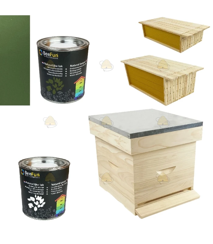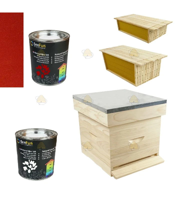 Starterspakket van een Premium Spaarkast grenen. Dit pakket bevat alle basisonderdelen die je nodig hebt een bijenvolk te kunnen huisvesten in een  Simplex Spaarkast (NL maat). De kast is gemaakt van een Premium kwaliteit grenen en bestaat uit een dak, dekplank, honingkamer (voorzien van 10 ramen met ingesmolten kunstraat), broedkamer (voorzien van 10 ramen met ingesmolten kunstraat), afstandsrepen en een bodem. Hieronder vind je alle onderdelen die de kast bevat. Zelfs de grondverf en de lakverf, op natuurlijke basis, worden meegeleverd!