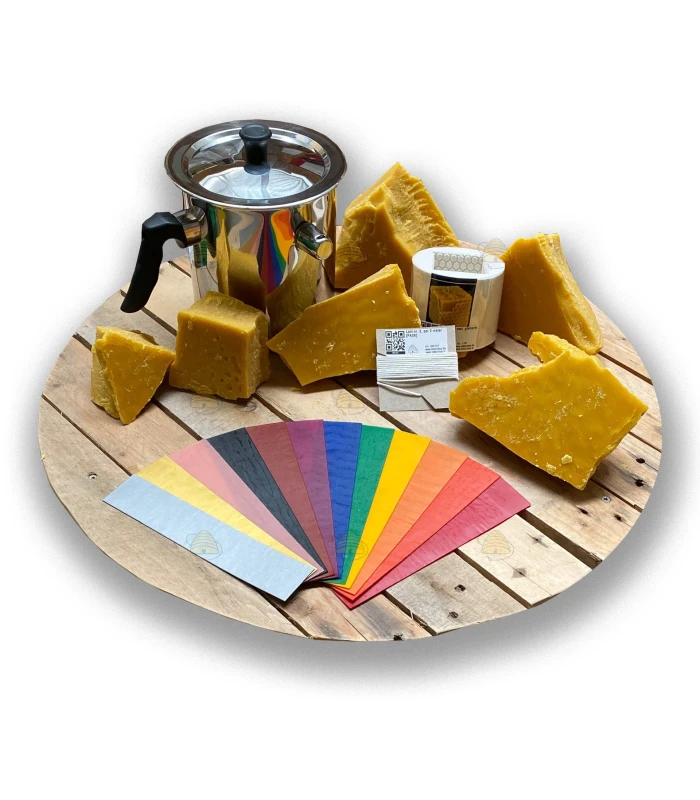 Pakket voor het maken van mooie raatkaarsen in kubusvorm. Met de wassmeltkan kan je de bijenwasbrokken smelten om er kaarsen van te kunnen gieten. De wasbrokken in dit pakket zijn goed voor het maken van zo'n 16 kaarsen. Je kan ze daarnaast nog versieren met de bijenwasstrips bestaande uit 12 verschillende kleuren.
