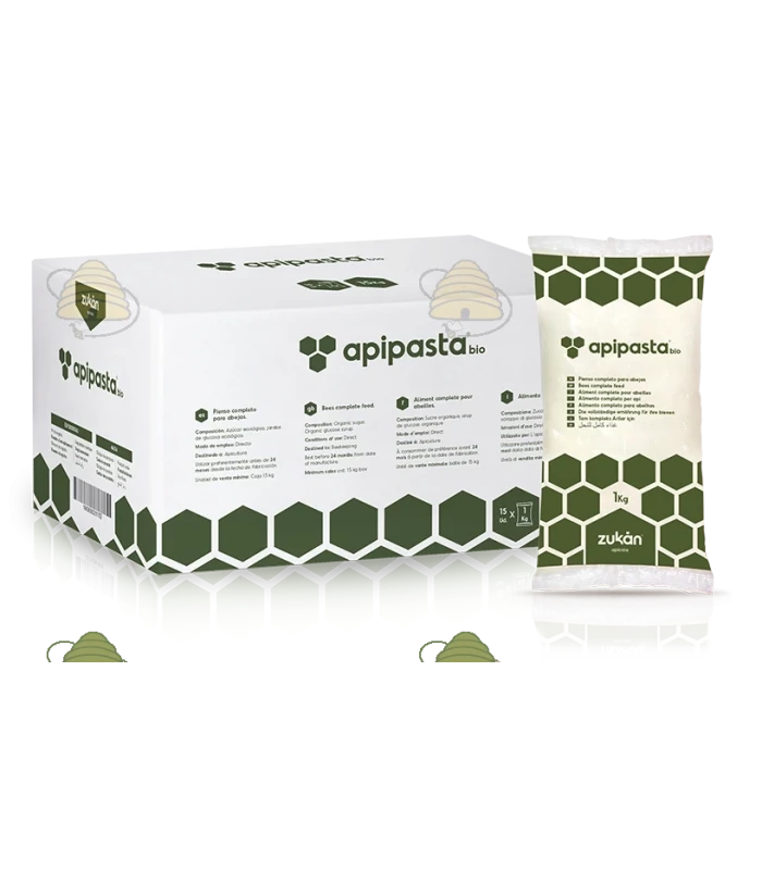 Biologisch suikerdeeg van het merk Apipasta, verpakt per 1 kg. Apipasta bio is gemaakt van biologische suikers, uit behoefte aan gecontroleerde en veilige voeding die voldoet aan de biologische productienormen van de Europese Unie. Apipasta is voornamelijk samengesteld uit sucrose, waardoor het zeer aantrekkelijk is voor bijen en gemakkelijk te gebruiken is voor imkers. Het deeg bestaat uit micro-kristallen en elke kristal is bedekt met een laagje glucosestroop. Speciaal zo ontworpen om gemakkelijk door de bijen opgenomen te worden.