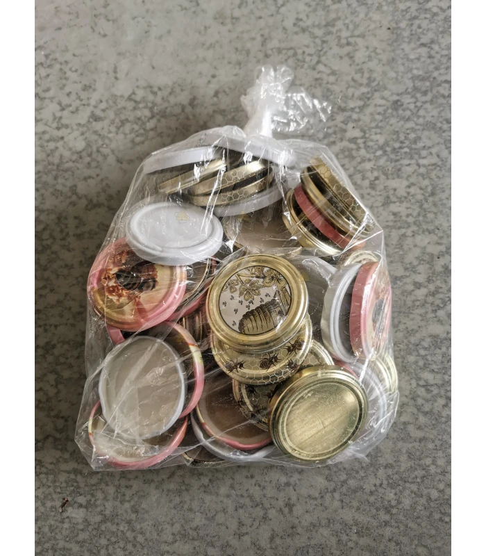 Assortiment TO 63 deksels in wit, goud en met roze bloem-bij-motief, verkocht per 60 stuks.