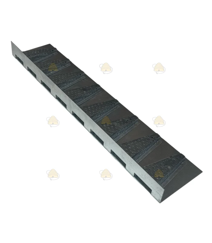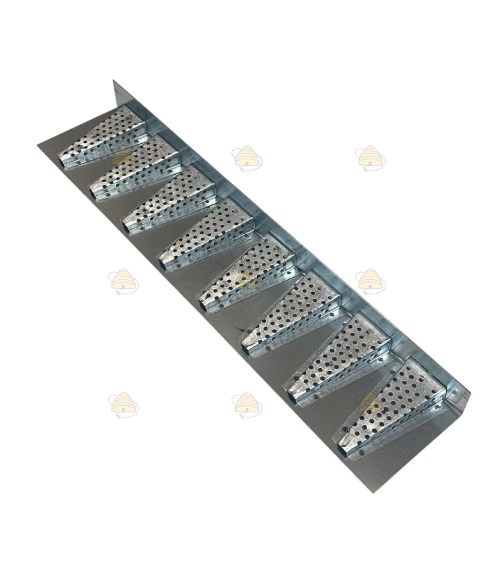 Door het monteren van deze fuik voor de bijenkast kan roverij en het binnendringen van hoornaars in het bijenvolk voorkomen worden. De strip kan voor de kast geschroefd worden of met een spanband er voor geklemd worden. De lengte is 41,5 cm,de hoogte is 3 cm en de breedte 8.5 cm. Het kan handig zijn om de vliegplank iets te verbreden (of een iets breder plaatje onder de protector te monteren zodat de bijen meer landingsruimte krijgen voor ze de protector in gaan.